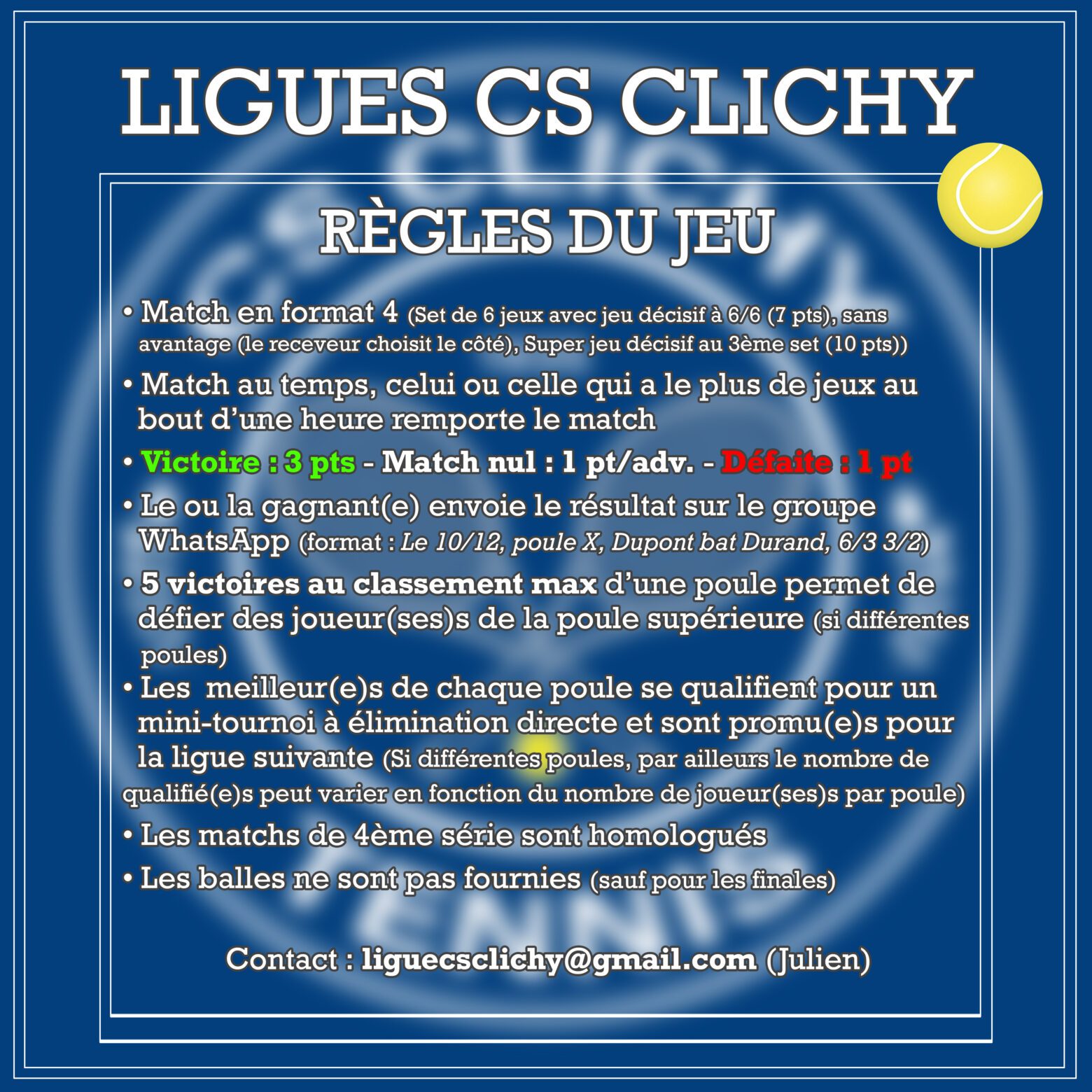 Afin de vous permettre de jouer dans un cadre compétitif mais compatible avec votre agenda parfois chargé, le CS CLICHY TENNIS vous organise des championnats toute l’année.